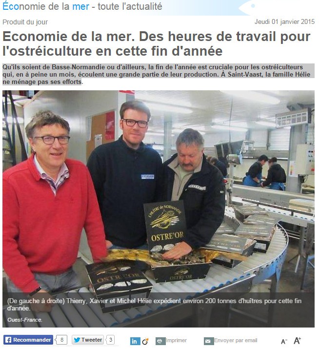Article paru dans le quotidien Ouest-France, début mars 2019. www.ouest-france.fr/normandie/saint-vaast-la-hougue-50550/saint-vaast-la-hougue-trois-generations-ostreicoles-chez-les-helie-4843672 Le journaliste explique la création et le développement de notre entreprise et la volonté de